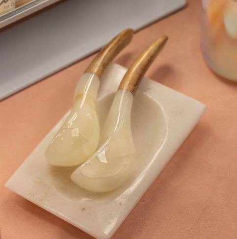 Fabricados en piedra ónix con propiedades refrigerantes, captan el máximo frío posible para asegurar su posterior difusión en contacto con la piel a lo largo del tratamiento. Esta herramienta se adapta cómodamente al contorno del rostro, cuello y escote, trabajando todas las inserciones musculares y permitiendo una presión eficaz sobre cada zona.